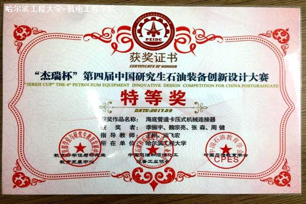 2017年9月23日至24日,“杰瑞杯”第四届中国研究生石油装备创新设计大赛决赛在东北石油大学举行。公司3377体育共有8件作品从1240件作品中脱颖而出,晋级全国总决赛,比赛分石油装备组和机械创新组,最终,8件作品获得:特等奖1项(上届空缺,本次比赛只有1项、石油装备组排名第一)、一等奖1项(机械组排名第二)、二等奖3项、三等奖3项,公司因为作品数量和获奖质量得到优秀组织奖,获奖创公司历史最好记录。 中国研究生石油装备创新设计大赛(Petroleum Equipment Innovative Design Competition For China Postgraduate)是“全国研究生创新实践系列活动”主题赛事之一,由教育部学位与研究生教育发展中心、中国石油和石油化工设备工业协会、中国石油教育学会联合主办,大赛每年举办一次。2016年正式纳入“全国研究生创新实践系列活动”。大赛自创办以来,紧密结合行业的需求发展,突出校企合作、产学结合的特点,得到了行业内企业大力支持。大赛秉承创新发展的理念,以“创新石油装备人才引领未来”为主题,围绕石油装备和机械装备行业的技术创新,为广大研究生提供创新交流和创新实践的平台,激发研究生的创新热情,培养研究生的创新思维,有效增强广大研究生的自主创新能力和综合实践能力,促进公司产品质量的提高,大赛自创办以来得到社会各界媒体的广泛报道,引起了良好的社会反响。 本届竞赛于2017年4月启动,分初赛、决赛两个阶段。共有来自全国48所参赛单位的1240支队伍参赛,其中204支参赛队伍成功晋级全国总决赛。 具体获奖作品名单: 海底管道卡压式机械连接器 李振宇 王立权 特等奖 仿生水液压阀体及水液压实验台设计 王海行 徐 贺 一等奖 主从式腹腔微创手术机器人 倪龙海 于凌涛 二等奖 电液复合式水下控制模块 张 驰 运飞宏 二等奖 基于气浮技术的仿水母清油平台 朱文锦 史冬岩、于 凯 二等奖 绳索牵引下肢康复机器人 杨海鹏 王克义 三等奖 仿生型混合驱动水下滑翔机 梁啸宇 史冬岩、滕晓燕 三等奖 电动手动双作用式半平衡大深度通海截止阀 李征远 赵丹、刘少刚 三等奖 |