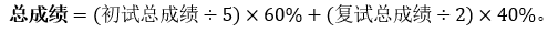 复试总成绩(200分)=综合素质面试成绩(60分)+基础科目考核(45分)+本专业理论知识测试成绩(45分)+外语测试成绩(50分)。复试总成绩达标线120分。