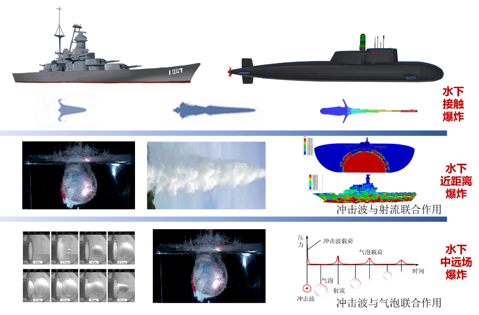 研究水下爆炸涉及的爆炸冲击动力学、气泡动力学、瞬态流固耦合动力学等基础问题,包括舰船船体结构抗爆抗冲击、舰用设备与系统(武器等)抗爆抗冲击、战位与舰员抗冲击、实船水下爆炸、水中兵器(高效)毁伤技术、水下发射技术、跨介质技术、飞行器爆炸分离技术、爆炸加工与成形等。为舰船毁伤及防护提供依据,也为海洋工程、兵器工程、机械工程、运载工程等其他相关领域提供基础性理论和技术支撑。