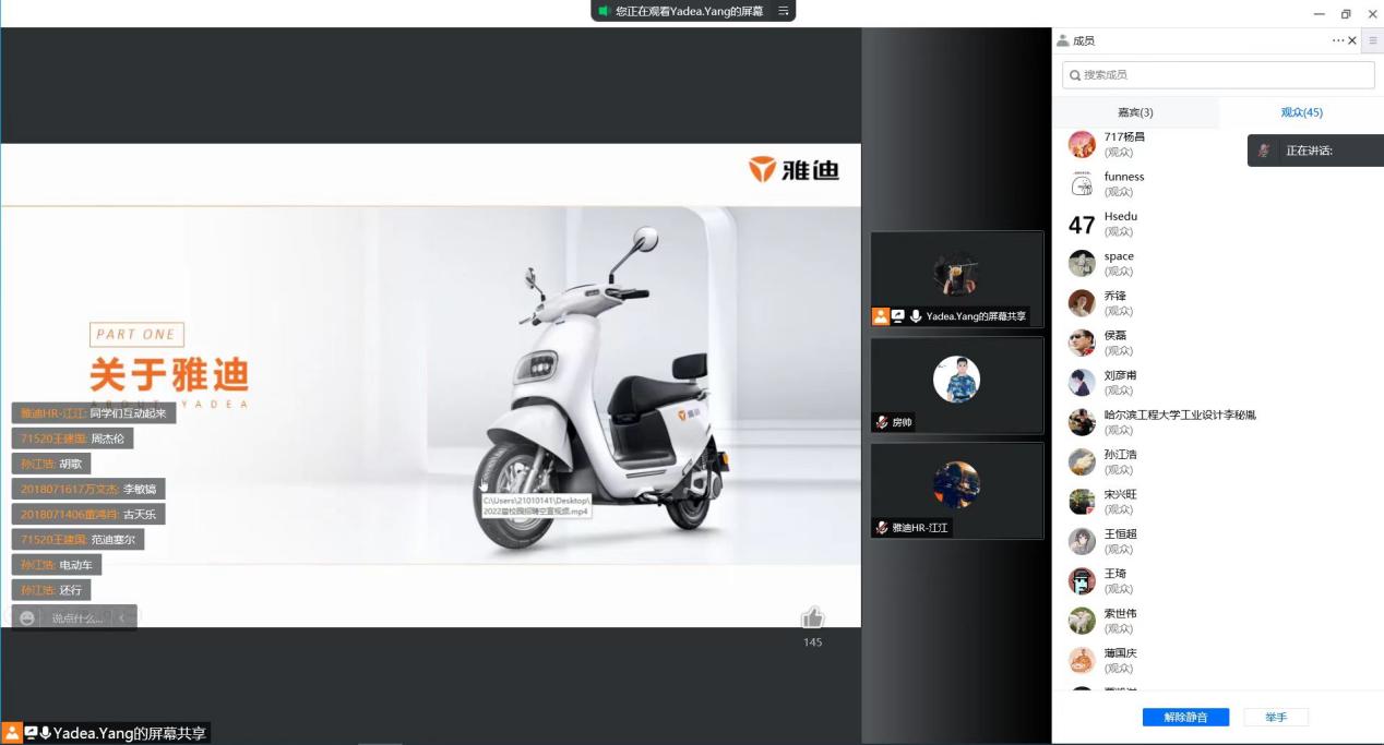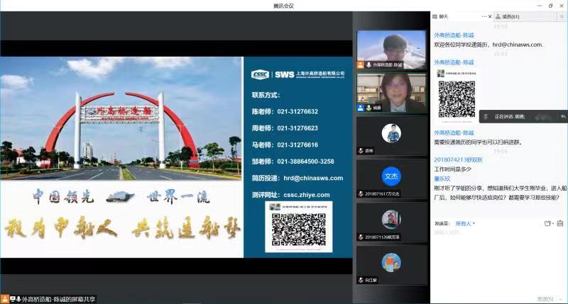 上海外高桥造船有限公司人力资源部部长、940341班学姐熊勇出席线上招聘会,为学弟学妹们答疑解惑。