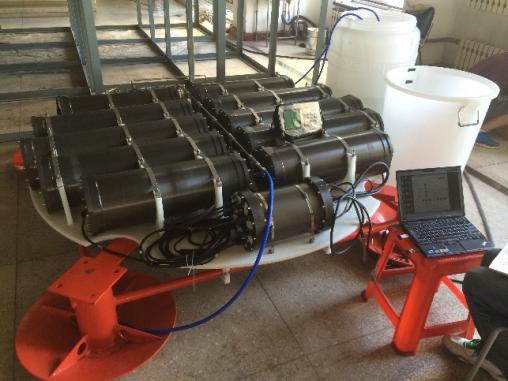 水下机器人的重心是水下机器人运动控制和姿态调节中用到的重要参数,基于三维模型进行估计会存在一定的误差,团队基于多点衡重法中可倾斜平台法,研制了水下机器人重心测量试验平台,设计开发了测量过程实时监控系统软件,并可在获得的重心坐标位置基础上,运用三维软件分析出机器人浮力、浮心,在水下机器人坐标系下,给出了水下机器人静态姿态调节的数学模型,为水下机器人的设计、试验提供准确的参数指导。