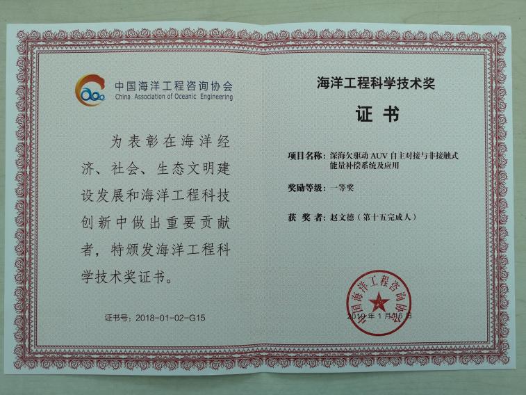十二五期间,团队参加“自治式潜器搭载对接技术”的研究工作,开展了AUV水下对接技术研究,为了实现欠驱动AUV的水下对接、充电及信息交换,研制了转轴回转驱动模块、锁死模块、定位触发机构、夹紧机构、充电对接模块及流速流向测量模块。转轴锁死模块具有制动力矩大、制动时间短的优点;回转驱动模块具有回转角度范围大、回转速度平稳的优点;定位触发机构模块具有感应灵敏度好、可靠性高的优点;夹紧机构模块夹紧力和顶升高度适中,满足使用要求;充电对接模块具有对接准确度高、自适应斜度大、间隙小等优点;流速流向模块具有测量精度高的优点。2019年1月,参研的“深海欠驱动AUV自主对接与非接触式能量补偿系统及应用”项目获海洋工程科学技术一等奖。