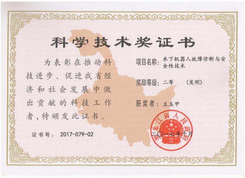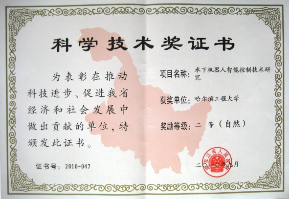 团队研制了开架式AUV、舵桨联控式AUV及小型全驱动AUV,可以完成自动定深定向定高航行,搭载各种类型声、光、磁探测设备,完成水下目标探测及作业,开发了AUV嵌入式硬件、软件控制系统及自主规划与智能控制算法。2010年9月,“水下机器人智能控制技术研究”获黑龙江省科学技术自然类二等奖。