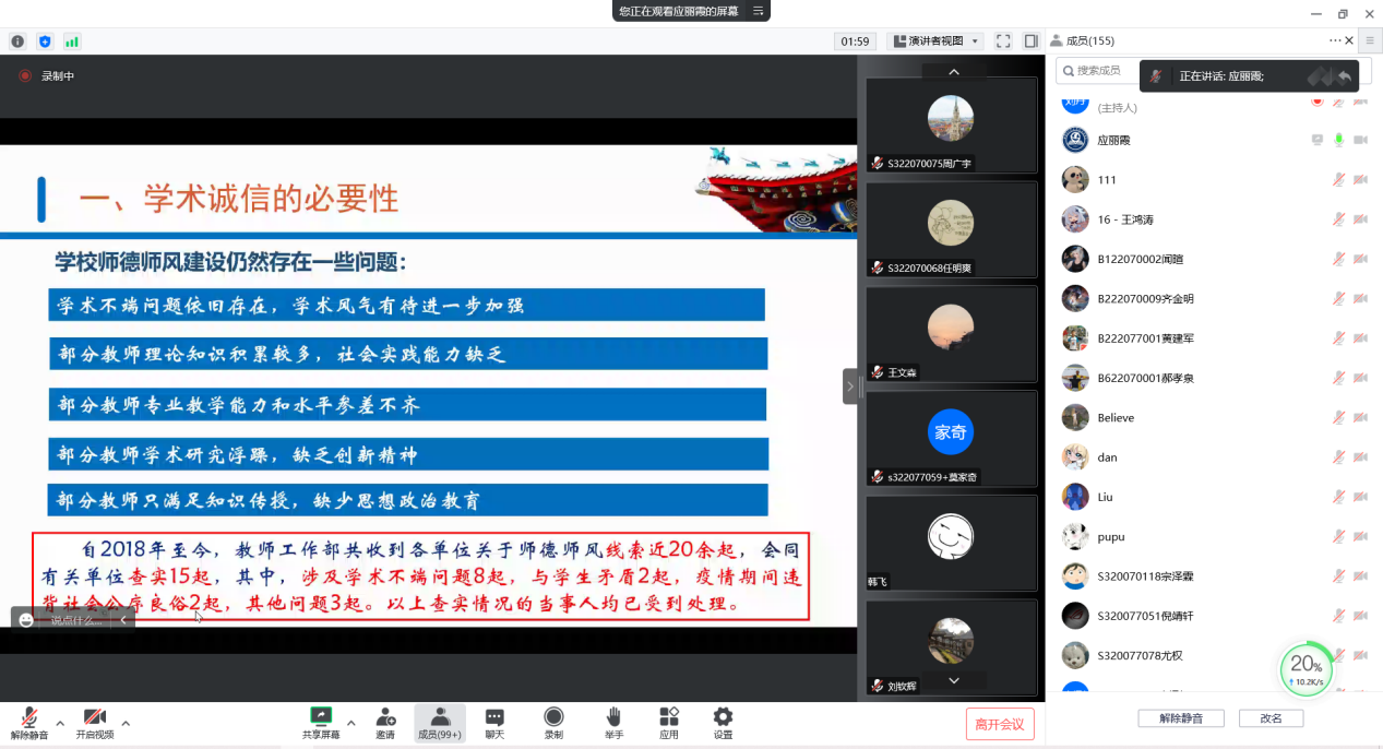 12月4日,公司开展研究生学术诚信与学风建设主题线上师生交流会。本次师生交流会由党委副书记侯磊主持,会议通过案例分析,师生共谈学术道德、学术规范和学术诚信建设,自觉抵制各种学术不端行为,树立良好学风。