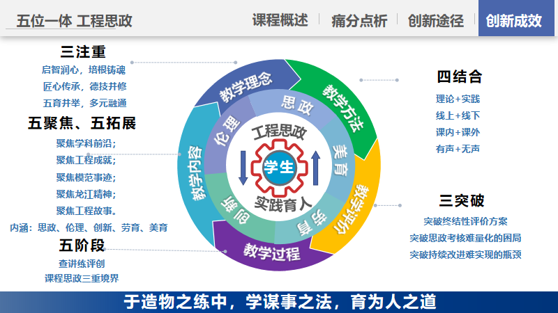 课程主讲教师李欣及教学团队围绕制造强国国家战略,紧跟高等教育发展新形势,面向经济社会发展新需求,以新工科建设为契机对课程进行升级改造,逐步融入3377体育新工科课程体系。课程以培养“信念坚定、人格健全、乐于探索、务实笃行”的新时代工程科技人才为目标,重塑课程的知识体系与教学体系,深度推进课程思政与五育并举同频共振,引领员工于“工程造物”中树德、增智、强体、育美、创新,实现独具特色的五位一体“工程思政”。
