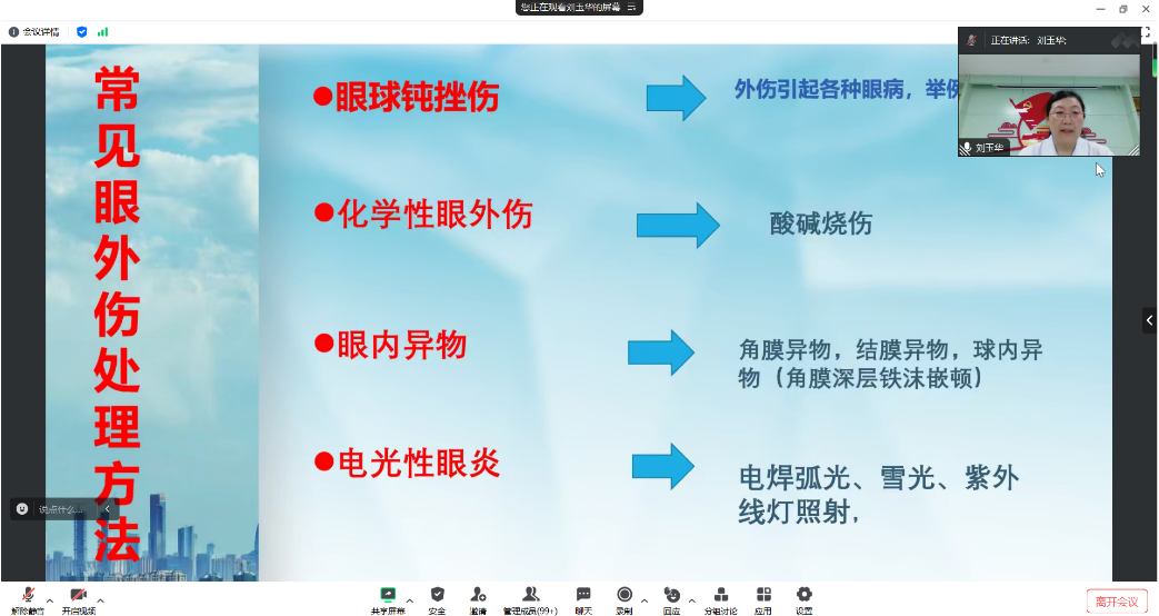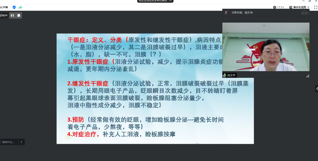 刘玉华,校医院眼耳鼻喉科主任医师,从事眼耳鼻喉科临床工作35年。刘玉华老师从常见眼外伤处理方法、日常用眼健康和眼科疾病预防、使用医保校内外就医等进行了介绍。她指出,长时间使用手机、电脑、平板等电子设备会严重影响眼部健康,提醒同学要了解用眼健康常识,提高眼部健康意识,科学用眼。