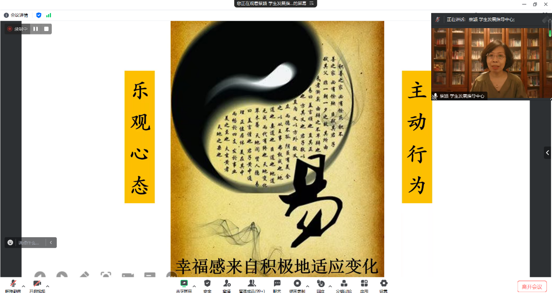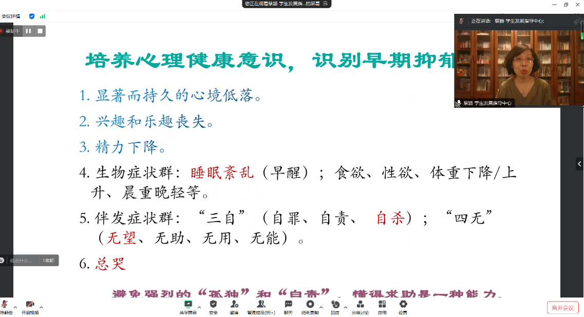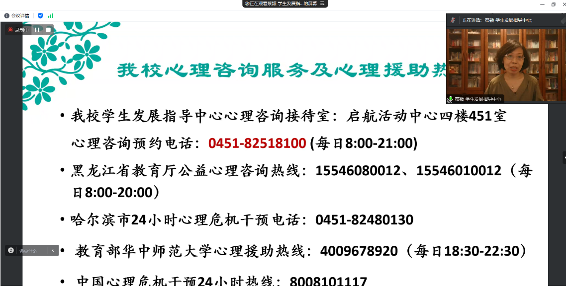 蔡颖,临床心理学博士,员工发展指导中心副教授,硕士生导师。中国心理学会临床心理学注册工作委员会注册督导师,国家二级心理咨询师,美国精神分析公司认证动力性治疗师、精神分析师候选人。黑龙江省应用心理学会音乐治疗专业委员会副主任委员,黑龙江省社会心理学会理事。蔡颖老师,以形象生动的比喻将心理健康问题比作人的感冒发烧病症,鼓励员工要以积极的心态面对由导学矛盾问题、人际关系紧张等引发的心理健康问题,积极主动向心理健康咨询老师的寻求帮助,并介绍了公司心理健康咨询中心的基本情况和心理健康咨询预约办法。