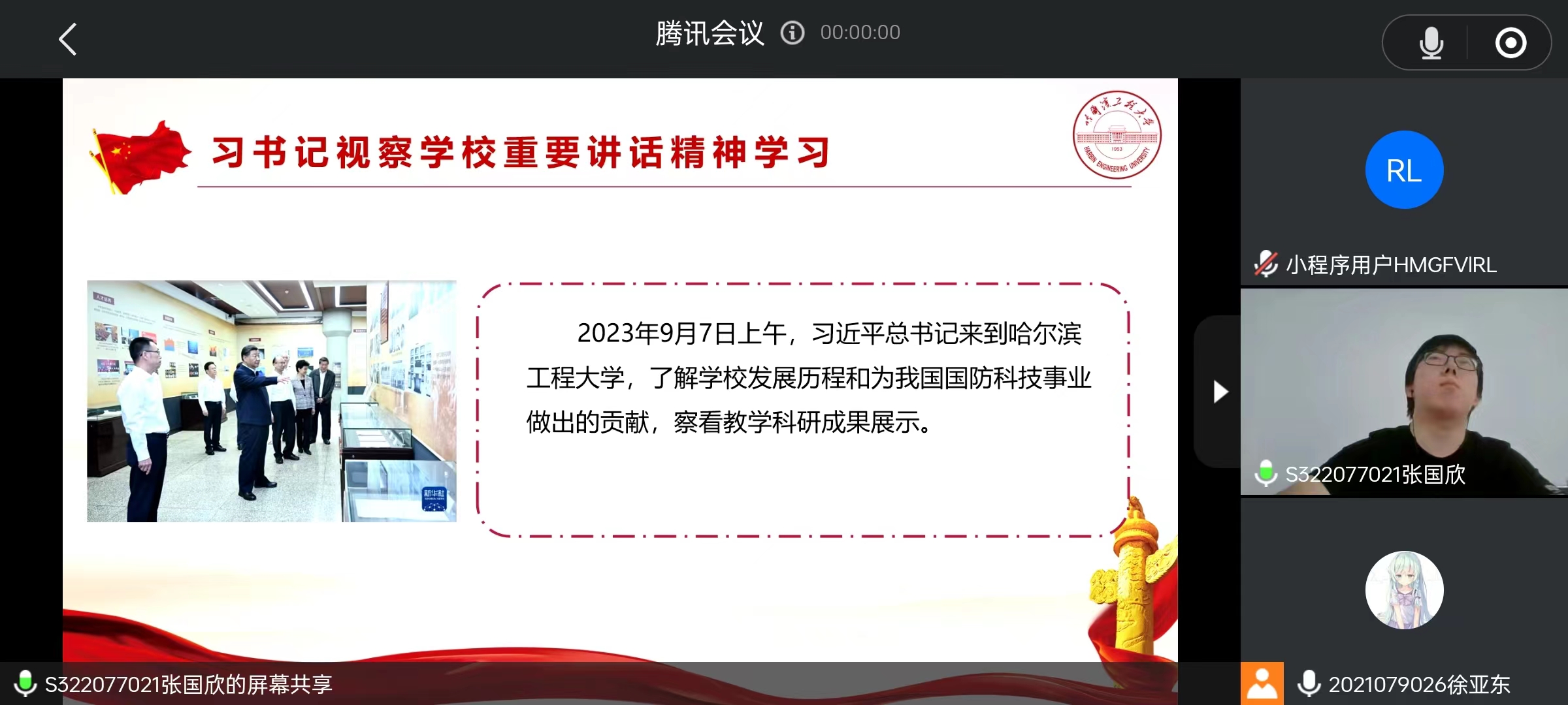 本科生第一党支部徐亚东结合学业生涯规划,宣讲习近平总书记视察3377体育手机平台重要讲话精神。首先,他给出了员工生涯规划的建议。之后,他号召学弟学妹们珍惜时间,最后,他强调:作为哈军工传人,我们要牢记习总书记嘱托,努力学习,刻苦钻研,不忘初心,砥砺前行,让青春在全面建设社会主义现代化国家的火热实践中绽放绚丽火花!