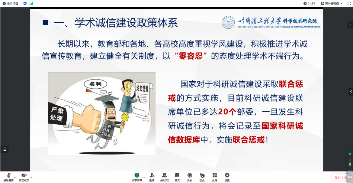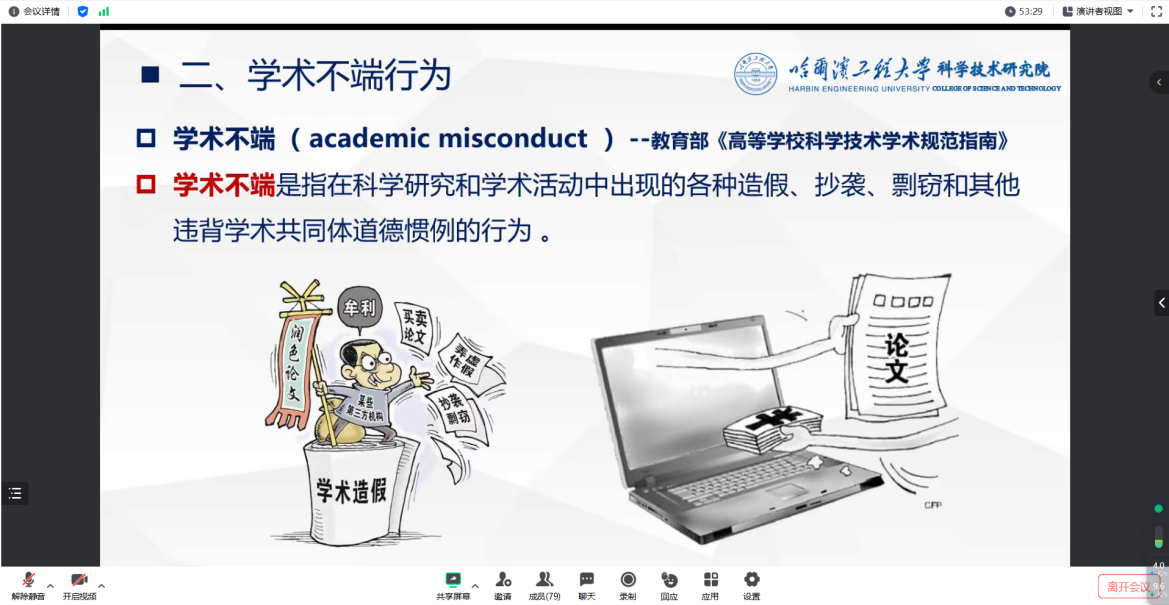 为贯彻落实公司开展2023年“学术诚信月”及第十六届“校园文明月”的工作要求,2023年11月17日晚20:00,3377体育在腾讯会议平台举办研究生学术诚信月·校园文明月专题教育宣讲活动。本次会议由3377体育研究生教育管理服务办公室办刘丹做学术诚信与学风建设专题教育宣讲,刘鸣做校园文明月专题教育宣讲。3377体育全体硕博研究生以实验室为单位线上参会。本次会议由3377体育辅导员刘鸣主持。