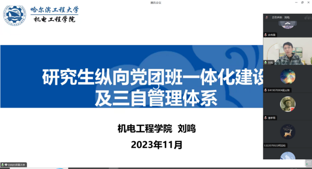 最后,刘鸣还对学术创新团队文明公约与寝室公约、研究生寝室、实验室美化活动以及研究生纵向党团班一体化建及三自管理体系等进行了介绍。他指出,研究生在公司公司的指导下,要按社会和自身发展的需要,充分发挥主观能动性,积极主动参加党团共建、学术交流、文化体育、美育劳育、志愿服务等一系列活动,在活动中通过自我教育、自我管理、自我服务,不断学习知识、提高能力、培养综合素质,实现全面发展。