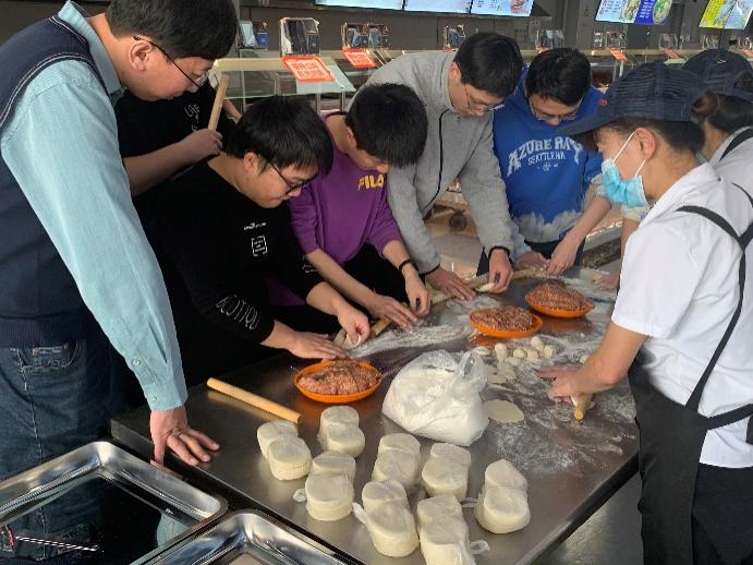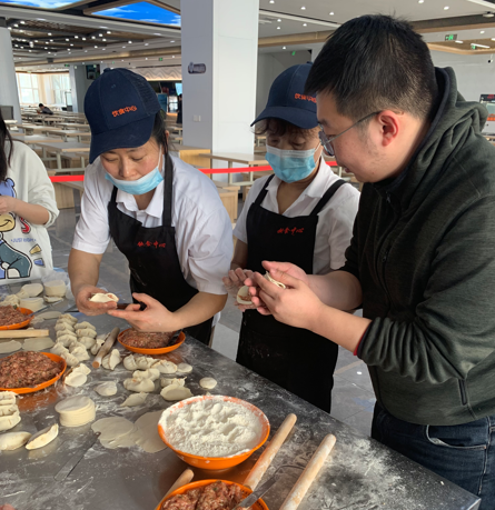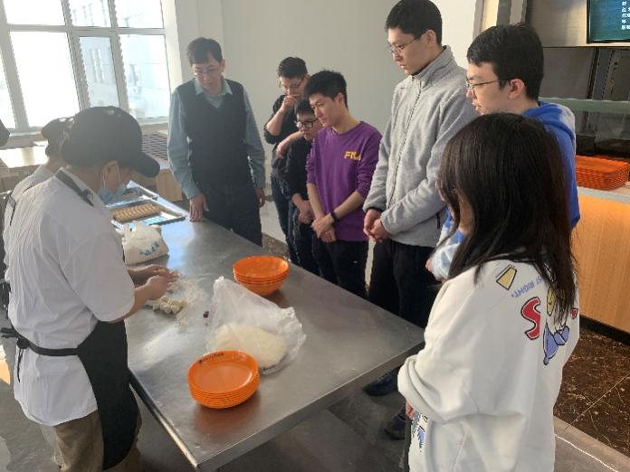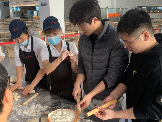 师生们在美食广场工作人员的指导学习调制馅料、擀皮、包饺子、煮饺子,初步掌握了东北特色美食——饺子的制作技巧。师生共同动手实践,互相交流心得,开展了一次气氛温馨欢乐的劳育实践活动。