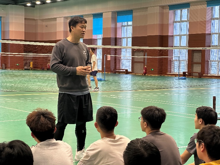 杨俊老师将党课与实践融合,指导同学们掌握科学的羽毛球运动技巧。