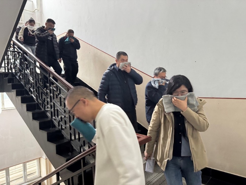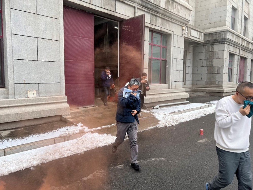 理论培训结束后,紧张有序的疏散演练正式拉开帷幕。为达到演练效果,本次演练分别从两个场地开始,模拟两个场景的疏散。场景一为某员工工作室突然发生火情并失控需紧急疏散,场景二为集体开会会场失火且无法扑灭。两个场景演练同步进行,设置了工作室员工与会场安全员火情报告求助电话演练。演练从火情报告开始,安全值班员接到员工的报警电话后评估火情并对员工下达撤离指令,员工工作室迅速组织员工疏散。会场这边按照现场指挥发出的具体指令,安全员引导逃生人员用湿毛巾捂住口鼻,按照预定的疏散路线迅速、有序地撤离至安全区域。全体师生均快速、安全疏散完毕,演练达到了预期效果。